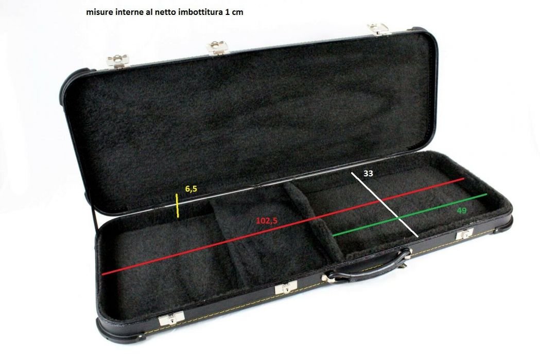 formato: per elettrica, misure interne al netto imbottitura di 1cm: 104X34,5X6,5 adatta per telecaster, stratocaster,sg e tanti tipi di elettrica...ne ho vendute già moltissime.... ADATTA ANCHE PER UNA JAZZ MASTER O JAGUAR