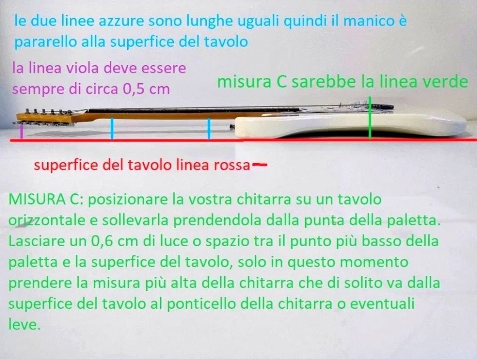 · MISURA C: posizionare la vostra chitarra su un tavolo orizzontale e sollevarla prendendola dalla punta della paletta. Lasciare un 0,6 cm di luce o spazio tra il punto più basso della paletta e la superfice del tavolo, solo in questo momento prendere la misura più alta della chitarra che di solito va dalla superfice del tavolo al ponticello della chitarra o eventuali leve.